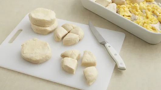 Step5Separate dough into 8 biscuits. Cut each biscuit into quarters. Place biscuit pieces on eggs.