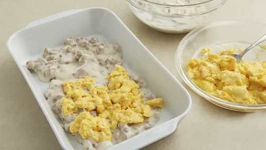 Step4Meanwhile, make gravy mix as directed on package. Stir gravy into sausage. Pour half of the sausage mixture into baking dish. Top with half of the cooked eggs; repeat layers.