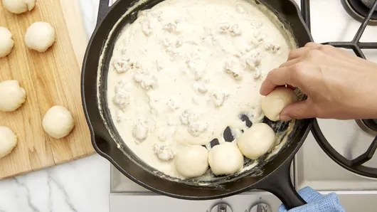 var configuration = {"title":"Biscuits and Gravy Skillet Dip","introduction":"It’s a little bit biscuits and gravy and a little bit hearty dip, but it’s 100% fun! Seasoned cream cheese-stuffed biscuit balls circle the outside of your skillet, leaving room for a sausage gravy dip that will easily win over your southern guests…and probably some Yankees, too!","servingSize":"1 Serving","image":{"small":{"media":"(min-width: 0px)","src":"https://mojo.generalmills.com/api/public/content/WmdPN53PqkqFdtgpIEo5EQ_webp_base.webp?v=0dca6f42\u0026t=e724eca7b3c24a8aaa6e089ed9e611fd"},"medium":{"media":"(min-width: 500px)","src":"https://mojo.generalmills.com/api/public/content/WmdPN53PqkqFdtgpIEo5EQ_webp_base.webp?v=0dca6f42\u0026t=191ddcab8d1c415fa10fa00a14351227"},"large":{"media":"(min-width: 767px)","src":"https://mojo.generalmills.com/api/public/content/WmdPN53PqkqFdtgpIEo5EQ_webp_base.webp?v=0dca6f42\u0026t=191ddcab8d1c415fa10fa00a14351227"},"alt":"Biscuits and Gravy Skillet Dip"},"contributor":{"label":"By","name":"Pillsbury Kitchens","profileUrl":"/about-us","displayDate":{"label":"Updated","date":"Oct 3, 2022"}},"ingredientGroups":[{"ingredients":[{"quantity":"1/2","description":"lb bulk pork breakfast sausage"},{"quantity":"1","description":"can (16.3 oz) refrigerated Pillsbury™ Grands!™ Flaky Layers Buttermilk Biscuits (8 Count)","productLink":"/products/biscuits/grands-refrigerated-biscuits/flaky-layers-buttermilk"},{"quantity":"1","description":"container (7.5 oz) chive and onion cream cheese spread, softened"},{"quantity":"3","description":"tablespoons butter"},{"quantity":"3","description":"tablespoons all-purpose flour"},{"quantity":"1/4","description":"teaspoon black pepper"},{"quantity":"2","description":"cups milk"}]}],"steps":[{"description":"Heat oven to 350°F. Spray 12-inch ovenproof skillet with cooking spray. Add sausage to skillet; cook 6 to 8 minutes over medium heat, stirring occasionally, until no longer pink and thoroughly cooked. Do not drain.","stepShotImageUrl":"//mojo.generalmills.com/api/public/content/tJvKLCWj2kiDrOw59c8GwA_webp_base.webp?v=e1f9db99\u0026t=51a43a57af4046789e5a7f20567b1195"},{"description":"Meanwhile, separate dough into 8 biscuits; separate each biscuit into 2 layers. Press each into 4-inch round. Place about 1 tablespoon of the cheese in center of each round. Gently fold edges up and over filling; pinch to seal. ","stepShotImageUrl":"//mojo.generalmills.com/api/public/content/91dDBGqsME6ttL3uY6-FbQ_webp_base.webp?v=dbe225e4\u0026t=51a43a57af4046789e5a7f20567b1195"},{"description":"Add 1 tablespoon of the butter to sausage and drippings in skillet; stir until melted. Stir in flour and pepper; cook over medium-high heat 1 to 2 minutes or until bubbling. Stir in milk; heat to simmering, stirring frequently. Cook and stir 1 to 3 minutes or until thickened. Remove from heat.","stepShotImageUrl":"//mojo.generalmills.com/api/public/content/W9YpthO93Eq5dxBeHv1XLg_webp_base.webp?v=e26322ba\u0026t=51a43a57af4046789e5a7f20567b1195"},{"description":"Melt remaining 2 tablespoons butter. Brush biscuits on all sides with butter.","stepShotImageUrl":"//mojo.generalmills.com/api/public/content/AvXLealuyUmBSdApivK0_w_webp_base.webp?v=668da41a\u0026t=51a43a57af4046789e5a7f20567b1195"},{"description":"Tilt skillet, and push gravy away from edges; place biscuits around edge of skillet.","stepShotImageUrl":"//mojo.generalmills.com/api/public/content/b_MVbnCDAECXz3RAOZJhpg_webp_base.webp?v=1567e42f\u0026t=51a43a57af4046789e5a7f20567b1195"},{"description":"Bake 22 to 26 minutes or until biscuits are cooked through and deep golden brown on top."}],"tips":[{"title":"","description":"For a pretty presentation, use a cast-iron skillet for this recipe.","category":"Serving Suggestions/Menu","tipShots":[]},{"title":"","description":"Make this recipe your own! Choose maple, sage or hot pork sausage instead of plain. ","category":"Substitution","tipShots":[]},{"title":"","description":"Top with sliced green onions, if desired.","category":"Presentation/Garnish","tipShots":[]},{"title":"","description":"Kitchen Tested: 8/2022","category":"Kitchen Tested","tipShots":[]}],"kitchenTips":[{"title":"","description":"For a pretty presentation, use a cast-iron skillet for this recipe.","category":"Serving Suggestions/Menu","tipShots":[]},{"title":"","description":"Make this recipe your own! Choose maple, sage or hot pork sausage instead of plain. ","category":"Substitution","tipShots":[]},{"title":"","description":"Top with sliced green onions, if desired.","category":"Presentation/Garnish","tipShots":[]}],"additionalContent":[],"faq":[],"tipCategories":[{"categoryName":"Kitchen Tested","heading":"More About This Recipe","cssClass":"recipePartStory","expandOnInit":false,"expandText":"More +","collapseText":"Less -","expandEventName":"","collapseEventName":"","image":"","tips":[{"title":"","description":"Kitchen Tested: 8/2022","category":"Kitchen Tested","tipShots":[]}],"isExpandable":false}],"nutritionInfo":{"configuration":{"showAsTable":false,"noNutritionInformationAvailableMessage":"No nutrition information available for this recipe","poweredByText":"\u003cp\u003eNutrition information for this recipe is estimated using a leading nutrition calculation application, but is an estimate only. Actual nutrition values will vary based on the exact ingredients or brands you may use.\u003c/p\u003e\n\u003ca href=\u0022http://developer.edamam.com\u0022\u003ePowered By \u003cimg src=\u0022-/media/C4F33FD467AB4A3AB59AAC4F6306AB04.ashx\u0022 alt=\u0022Edamam\u0022 /\u003e\u003c/a\u003e","nutritionChartTitle":"Nutrition Facts","nutritionInformationLabel":"Nutrition","servingSizeText":"Serving Size:","dailyValuesDisclaimer":"*Percent Daily Values are based on a 2,000 calorie diet.","percentDailyValueText":"% Daily Value","percentDailyValueFooterTitleText":"% Daily Value*:","exchangeInformationTitleText":"Exchanges:","nutritionFactsExpandText":"More Nutrition","nutritionFactsCollapseText":"
