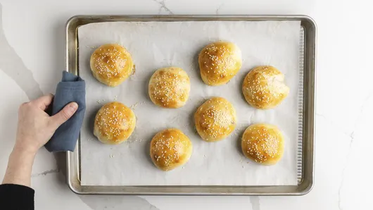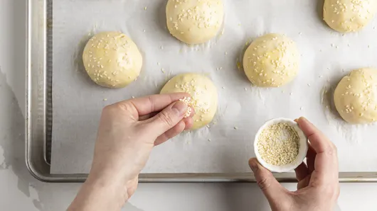 Place seam-side down on sheet pan, 2 inches apart. Brush tops with beaten egg, and sprinkle with sesame seed.