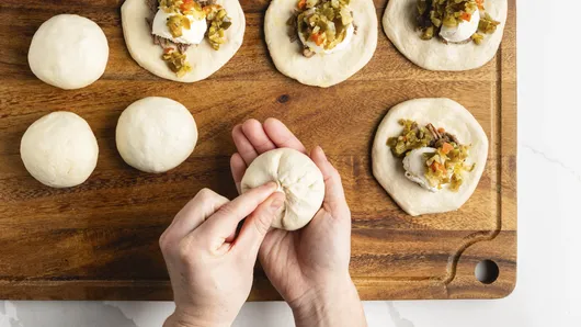 Fold and seal dough around filling of each round to form a ball. Pinch edges tightly.
