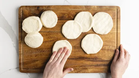 Flatten each biscuit into a 4-inch round and top with a spoonful each of roast beef, cream cheese, and giardiniera. We found that finely shredding the beef makes it easier to fit into the bite. Also, be sure to drain the giardiniera well before adding; if there’s too much liquid, the dough will be harder to pinch together and seal properly.