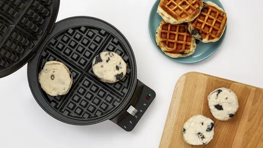 Place 2 biscuits at a time on hot waffle maker. Close lid of waffle maker; bake 2 to 3 minutes or until light golden brown. Carefully remove waffles. Repeat with remaining biscuits, greasing waffle maker between each set.