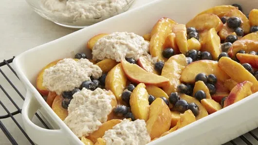 var configuration = {"title":"Blueberry-Peach Cobbler","introduction":"This recipe is so good-looking you should pause for a second before you dig in. Feast with your eyes. Then feast with your mouth. Then feast with your family, if you feel like sharing.","servingSize":"1 Serving","image":{"small":{"media":"(min-width: 0px)","src":"https://mojo.generalmills.com/api/public/content/UV5m8oqpq022f9bad6x6Yg_webp_base.webp?v=9ab31d69\u0026t=e724eca7b3c24a8aaa6e089ed9e611fd"},"medium":{"media":"(min-width: 500px)","src":"https://mojo.generalmills.com/api/public/content/UV5m8oqpq022f9bad6x6Yg_webp_base.webp?v=9ab31d69\u0026t=191ddcab8d1c415fa10fa00a14351227"},"large":{"media":"(min-width: 767px)","src":"https://mojo.generalmills.com/api/public/content/UV5m8oqpq022f9bad6x6Yg_webp_base.webp?v=9ab31d69\u0026t=191ddcab8d1c415fa10fa00a14351227"},"alt":"Blueberry-Peach Cobbler"},"contributor":{"label":"By","name":"Pillsbury Kitchens","profileUrl":"/about-us","displayDate":{"label":"Updated","date":"Aug 28, 2023"}},"ingredientGroups":[{"name":"Biscuit Dough","ingredients":[{"quantity":"1 1/2","description":"cups Gold Medal™ organic all-purpose flour"},{"quantity":"1/4","description":"cup cane sugar"},{"quantity":"2","description":"teaspoons baking powder"},{"quantity":"1/2","description":"teaspoon ground cinnamon"},{"quantity":"1/2","description":"teaspoon salt"},{"quantity":"1/4","description":"cup cold butter, cut into pieces"},{"quantity":"3/4","description":"cup cold milk"}]},{"name":"Filling","ingredients":[{"quantity":"1/2","description":"cup cane sugar"},{"quantity":"3","description":"tablespoons Gold Medal™ organic all-purpose flour"},{"quantity":"1","description":"teaspoon ground cinnamon"},{"quantity":"1/2","description":"teaspoon ground ginger"},{"quantity":"7 1/2","description":"cups sliced fresh peaches (about 9 peaches) or 3 bags (12 oz each) frozen peaches, thawed as directed on bag"},{"quantity":"1","description":"tablespoon lemon juice"},{"quantity":"2","description":"cups fresh blueberries"}]}],"steps":[{"description":"Heat oven to 400°F. Spray 13x9-inch (3-quart) glass baking dish with cooking spray.\r\n","stepShotImageUrl":"//mojo.generalmills.com/api/public/content/-QXs317Lb0m4_dvhSZyIVA_webp_base.webp?v=f757643d\u0026t=51a43a57af4046789e5a7f20567b1195"},{"description":"In medium bowl, stir together 1 1/2 cups flour, 1/4 cup sugar, the baking powder, 1/2 teaspoon cinnamon and salt. Cut in butter, using pastry blender or fork, until mixture looks like coarse crumbs. Stir in milk just until combined; set aside.\r\n","stepShotImageUrl":"//mojo.generalmills.com/api/public/content/z0kR_Z6ibUCM0rWn6CQ-PA_webp_base.webp?v=b49e5ae4\u0026t=51a43a57af4046789e5a7f20567b1195"},{"description":"In 4-quart saucepan, stir together 1/2 cup sugar, 3 tablespoons flour, 1 teaspoon cinnamon and the ginger. Stir in peaches and lemon juice. Heat to boiling over medium-high heat, stirring constantly. Boil 1 minute. Remove from heat; stir in blueberries. Spoon hot fruit mixture into baking dish. Immediately drop biscuit dough by 12 spoonfuls onto hot mixture.","stepShotImageUrl":"//mojo.generalmills.com/api/public/content/pwPjJFynnU6qi_W5jd2urg_webp_base.webp?v=408d2fd8\u0026t=51a43a57af4046789e5a7f20567b1195"},{"description":"Bake 25 to 28 minutes or until biscuits are golden brown. Cool 15 minutes before serving."}],"tips":[{"title":"","description":"Frozen peaches are always available — if fresh peaches aren’t in season, you can substitute.","category":"Substitution","tipShots":[]},{"title":"","description":"Serve with homemade whipped cream or your favorite ice cream.","category":"Serving Suggestions/Menu","tipShots":[]},{"title":"","description":"Add a sparkly crunch to the biscuits by sprinkling them with a few dashes of coarse sparkling sugar just before baking.","category":"Recipe/Ingredient Facts","tipShots":[]},{"title":"","description":"Recipe meets Kitchen Tested criteria. Reviewed as part of SEO improvements Oct. 2019.","category":"Kitchen Tested","tipShots":[]}],"kitchenTips":[{"title":"","description":"Frozen peaches are always available — if fresh peaches aren’t in season, you can substitute.","category":"Substitution","tipShots":[]},{"title":"","description":"Serve with homemade whipped cream or your favorite ice cream.","category":"Serving Suggestions/Menu","tipShots":[]},{"title":"","description":"Add a sparkly crunch to the biscuits by sprinkling them with a few dashes of coarse sparkling sugar just before baking.","category":"Recipe/Ingredient Facts","tipShots":[]}],"additionalContent":[],"faq":[],"tipCategories":[{"categoryName":"Kitchen Tested","heading":"More About This Recipe","cssClass":"recipePartStory","expandOnInit":false,"expandText":"More +","collapseText":"Less -","expandEventName":"","collapseEventName":"","image":"","tips":[{"title":"","description":"Recipe meets Kitchen Tested criteria. Reviewed as part of SEO improvements Oct. 2019.","category":"Kitchen Tested","tipShots":[]}],"isExpandable":false}],"nutritionInfo":{"configuration":{"showAsTable":false,"noNutritionInformationAvailableMessage":"No nutrition information available for this recipe","poweredByText":"\u003cp\u003eNutrition information for this recipe is estimated using a leading nutrition calculation application, but is an estimate only. Actual nutrition values will vary based on the exact ingredients or brands you may use.\u003c/p\u003e\n\u003ca href=\u0022http://developer.edamam.com\u0022\u003ePowered By \u003cimg src=\u0022-/media/C4F33FD467AB4A3AB59AAC4F6306AB04.ashx\u0022 alt=\u0022Edamam\u0022 /\u003e\u003c/a\u003e","nutritionChartTitle":"Nutrition Facts","nutritionInformationLabel":"Nutrition","servingSizeText":"Serving Size:","dailyValuesDisclaimer":"*Percent Daily Values are based on a 2,000 calorie diet.","percentDailyValueText":"% Daily Value","percentDailyValueFooterTitleText":"% Daily Value*:","exchangeInformationTitleText":"Exchanges:","nutritionFactsExpandText":"More Nutrition","nu