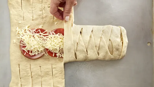 With scissors or sharp knife, make cuts 1 inch apart on long sides of dough to within 1/2 inch of filling. Alternately cross strips over filling. Fold ends under to seal.