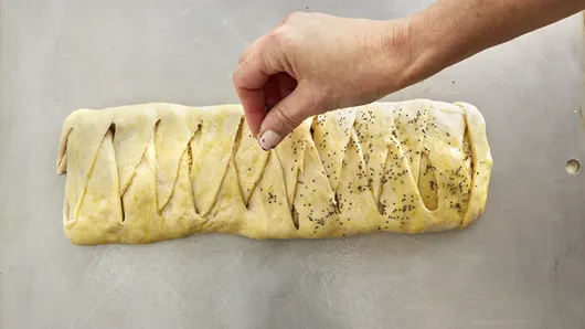 In small bowl, mix egg yolk and water until well blended. Brush over dough; sprinkle with poppy seed.