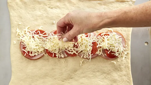 Spread garlic and herb cheese lengthwise down center 1/3 of rectangle to within 1/2 inch of short ends. Top with Canadian bacon, pepperoni, mozzarella and Parmesan cheese.