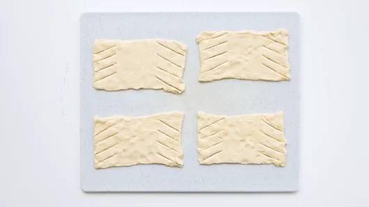 Step3Unroll dough; separate into 4 rectangles and press seams to seal. Use knife to make 4 angled slices on short sides of each rectangle, leaving about 3 inches of uncut dough in center.