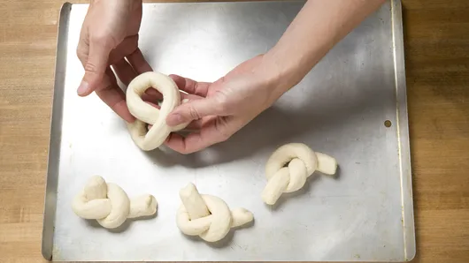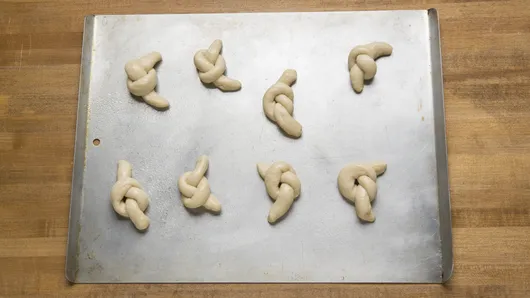 Step2Place on cookie sheet. Brush with egg white. Repeat with remaining dough to make 16 knots.
