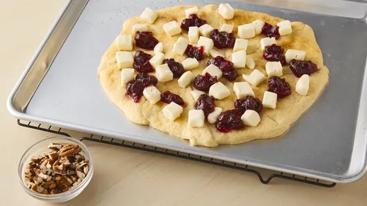 Step2Remove crust from oven. Sprinkle cheese over partially baked crust. Place cranberry sauce in small bowl; stir to break up pieces. Spoon cranberry sauce by teaspoonfuls evenly over cheese. Sprinkle with pecans.