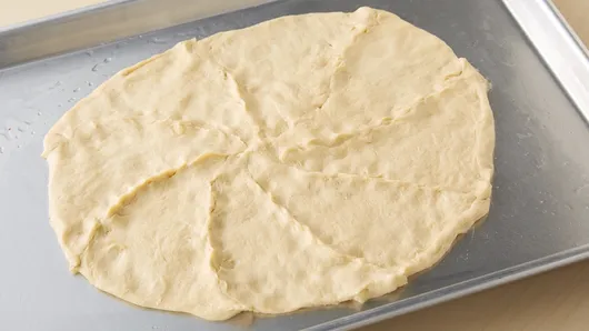 Step1Heat oven to 425°F. Lightly oil 12-inch pizza pan or 13x9-inch pan with olive or vegetable oil. Unroll dough; separate into triangles. Place triangles in oiled pan with tips toward center. Press out dough with hands. Bake at 425°F. for 5 to 8 minutes or until light golden brown.