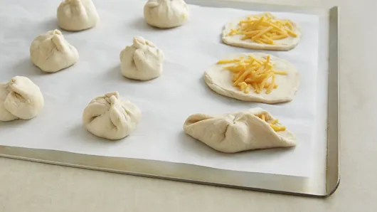 Step2For each bobber, place 1 tablespoon cheese in center of 1 round. Pull up dough around cheese, and pinch to seal. Place bobbers seam side up 2 inches apart on cookie sheet. Bake 15 to 17 minutes or until golden brown.