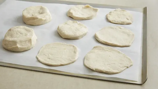 Step1Heat oven to 350°F. Line large cookie sheet with cooking parchment paper. Separate dough into 5 biscuits. Separate each biscuit into 2 layers, then press each to form 4-inch round.