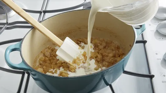 Step4Slowly stream in milk, stirring constantly. Heat to simmering; reduce heat and cook 5 minutes longer, stirring frequently, until milk has thickened.