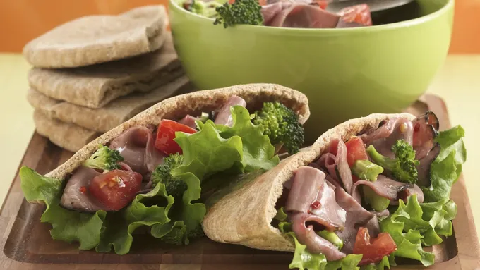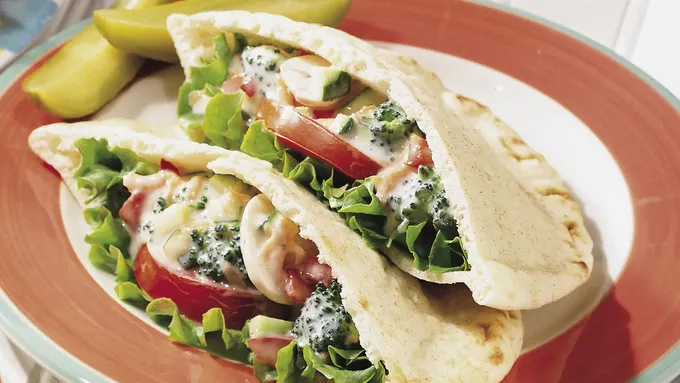 Enjoy your dinner with broccoli sandwiches flavored with ranch salad dressing made using pita bread – ready in 15 minutes.