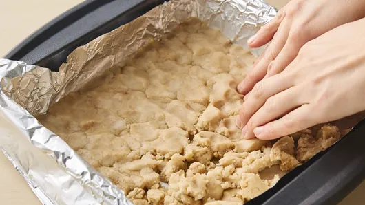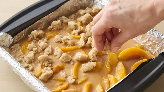 Crumble remaining dough mixture on top of peach layer. Bake 32 to 35 minutes or until dough is set and light golden brown. Cool completely, about 2 hours.