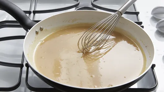 Step2Cook over low heat, stirring constantly, until mixture has thickened; remove from heat. Gradually stir in reserved drippings plus enough broth or water to equal 1 cup. Heat to boiling, stirring constantly. Boil and stir 1 minute. Stir in a few drops browning sauce for darker color. Stir in salt and pepper.
