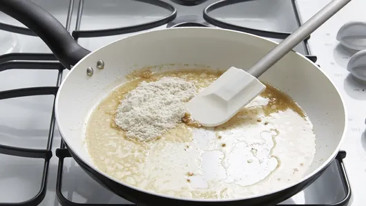 Step1After removing beef from pan, scrape all brown particles from pan, and pour particles and drippings into bowl or glass measuring cup. Skim 2 tablespoons fat from top of drippings; add fat to 1-quart saucepan. Discard any remaining fat; reserve remaining drippings. Stir flour into fat in saucepan.