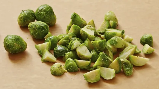 Step3Meanwhile, microwave frozen Brussels sprouts as directed on package. Drain; coarsely chop.