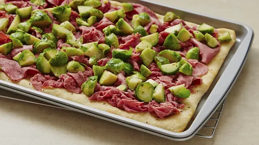 Step4Top partially baked crust with corned beef, Brussels sprouts and cheese. Bake an additional 7 to 10 minutes or until cheese is melted. Cut into 6 rows by 4 rows; drizzle with dressing.