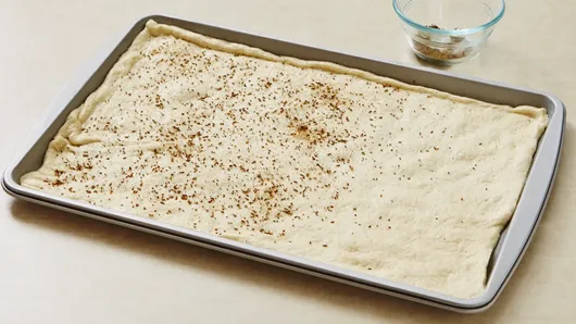 Step1Heat oven to 400°F. Unroll dough in ungreased 15x10-inch nonstick pan with sides. Starting at center, press out dough to edges of pan. Sprinkle caraway seed over dough; press gently into crust.