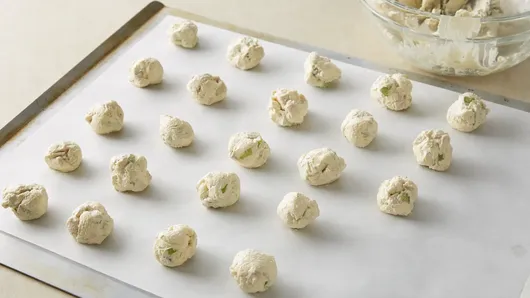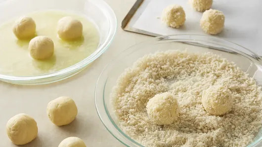Step3In shallow dish, place melted butter. In another shallow dish, place bread crumbs. Dip dough balls into butter, then roll in bread crumbs. Place 2 inches apart on large ungreased cookie sheet. Bake 17 to 22 minutes or until golden brown. Cool 5 minutes. Serve warm.