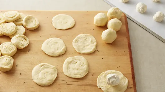 Step2Meanwhile, heat oven to 350°F. If using crescent rounds, remove from package, but do not separate rounds. If using crescent rolls, remove from package, but do not unroll. Using serrated knife, cut each roll evenly into 16 rounds; carefully separate rounds. Press each round to 3 inches in diameter. Place chilled chicken mixture ball on center of each dough round; shape dough around ball to cover completely.