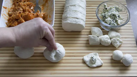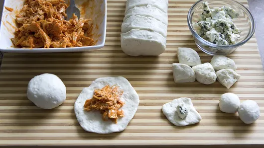 Step3Separate dough into 8 biscuits. Cut biscuits into quarters to make a total of 32 pieces. Press each biscuit piece into thin triangle. Place a rounded teaspoonful of the chicken mixture in center of each piece of dough. Enclose mixture by bringing sides of dough up and over; pinch dough to seal.