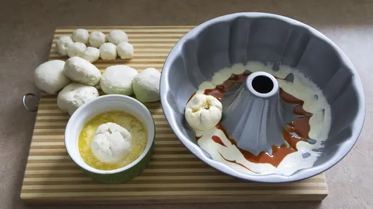 Step1Heat oven to 375°F. Generously spray 12-cup fluted tube cake pan with cooking spray. Pour 2 tablespoons of the Buffalo wing sauce in bottom of pan. Drizzle with 1 tablespoon of the ranch dressing.