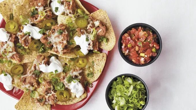 - Though nachos are a traditional Mexican snack, this nachos grande recipe takes the concept of nachos and reinvents it with the help of a classic American dish: Buffalo chicken wings. Doused in a hot sauce and served with blue cheese, ranch and celery sticks, Buffalo wings are a staple appetizer in many American households (especially during football season!). This buffalo chicken nachos recipe is the best of both recipes. Crunchy tortilla chips get piled on a giant platter with shredded rotisserie chicken, buffalo wing sauce, blue cheese and mozzarella cheese. The result is your new favorite appetizer! Though this recipe isn’t your typical nachos recipe, that’s part of the fun. Nachos can be customized to so many tastes, and we have a recipe for everyone. Want to dive into some more Mexican-inspired dishes? Learn how to make enchiladas next!