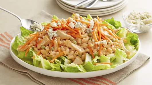 Step3Arrange romaine on large platter. Top with pasta mixture, followed by carrots and blue cheese.