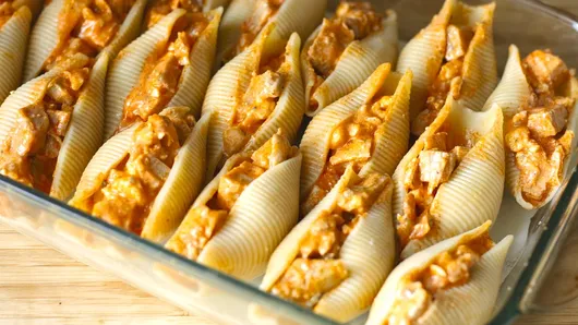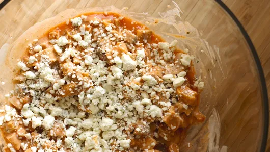 Step5Add 1/2 cup of the blue cheese sauce to bottom of baking dish. Divide chicken filling among shells, about 2 tablespoons each, and place in baking dish.