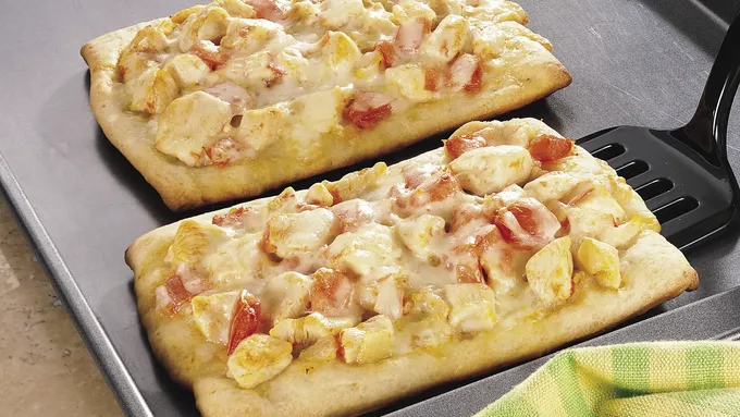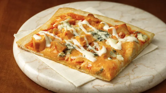 Step2In medium bowl, mix dressing, wing sauce and chicken; spread evenly over partially baked crust. Top with bacon, cheese and chiles. Bake 8 to 10 minutes longer or until crust is golden brown.