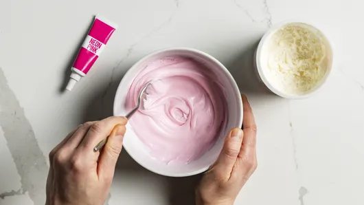 In medium microwavable bowl, stir frosting and 1 to 3 drops pink food color until well blended. Microwave uncovered on High 10 to 15 seconds or until soft but not translucent.
