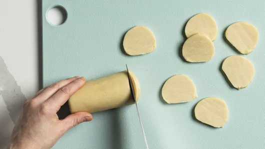 Wrap in plastic wrap; refrigerate 30 minutes. Remove plastic wrap. Cut cookie dough into 33 slices, each just under 1/4-inch thick.