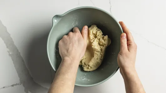 Heat oven to 350°F. In large bowl, knead cookie dough and flour with hands until well mixed. (DO NOT EAT RAW COOKIE DOUGH AFTER COMBINING WITH FLOUR.)