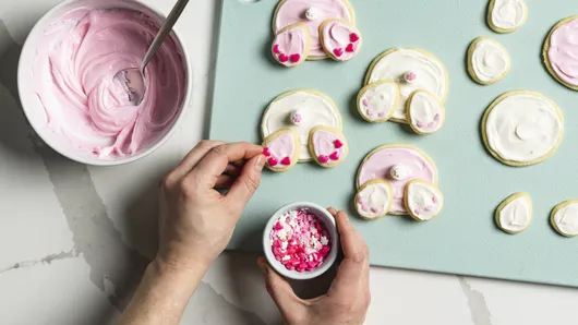 To make bunny butt, frost 1 whole cookie slice and 2 bunny feet. Place bunny feet on bottom of cookie as shown in photo. Place 1 marshmallow in center of each cookie for tail. Decorate bunny paws with candy sprinkles. Repeat with remaining cookie slices and bunny feet.
