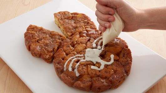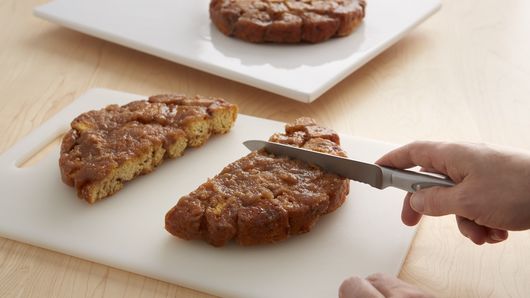 Step4Bake 25 to 30 minutes or until golden brown and no longer doughy in center. Cool 10 minutes. Place heatproof serving plate upside down over pan; turn plate and pan over. Remove pan.