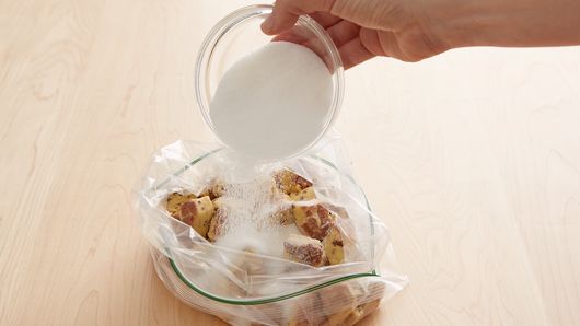 Step2Separate each can of dough into 8 rolls; set icing aside. Cut each roll into quarters. Place pieces in large resealable food-storage plastic bag; add granulated sugar. Seal bag; shake gently to coat. Arrange roll pieces in pans.