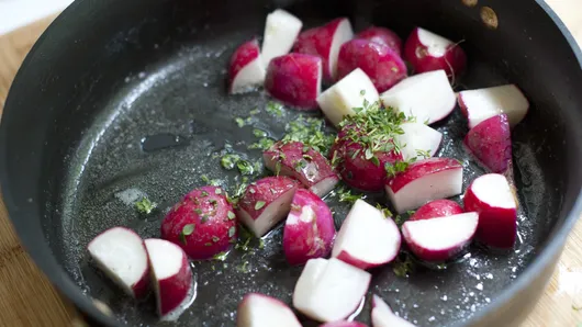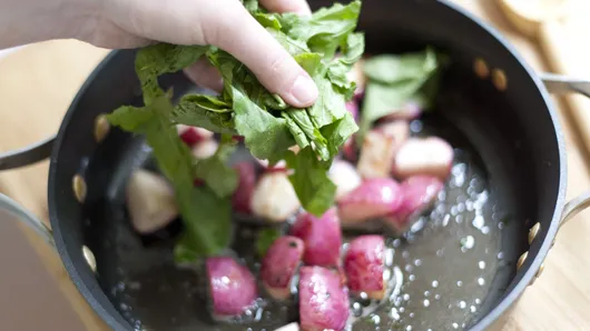 Step3Pull green leaves from radish stems, and add to cooked radishes along with sliced green onions. Cook about 1 minute or until leaves have wilted.