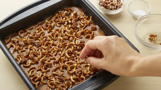 Step4In medium microwavable bowl, microwave caramels and milk uncovered on High 2 to 3 minutes, stirring every 60 seconds, until melted and smooth. Pour evenly over bar. Sprinkle with pretzels and remaining 1/4 cup pecans, pressing slightly into caramel. Sprinkle with salt. Cool about 1 hour 30 minutes or until caramel is set. For bars, cut into 4 rows by 4 rows. Store covered in refrigerator.