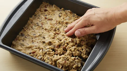 Step2In medium bowl, crumble cookie dough; stir or knead in 1/2 cup of the pecans until well mixed. Press evenly in ungreased 9-inch square pan.