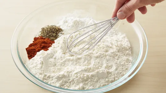 Step2In pie pan, mix flour and all remaining chicken ingredients except oil. Heat about 1/2 inch oil in 12-inch skillet over medium-high heat.