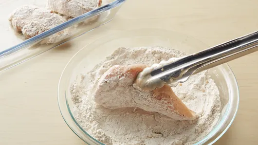 Step3Remove chicken pieces from marinade a few at a time, allowing excess to drip off. Roll chicken in flour mixture until well coated. Add chicken to hot oil in skillet, a few pieces at a time until all pieces are in skillet. Cover; cook over medium-high heat 10 minutes or until deep golden brown. Discard marinade.