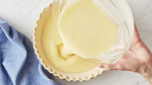 To prevent ingredients from separating during baking, make sure the eggs, butter and buttermilk for the filling are all at room temperature before mixing them together. That said, some butter may still leak from the pie in the oven. To prevent any burned bits on the oven floor, we recommend placing a piece of foil on the oven rack below the pie before baking.