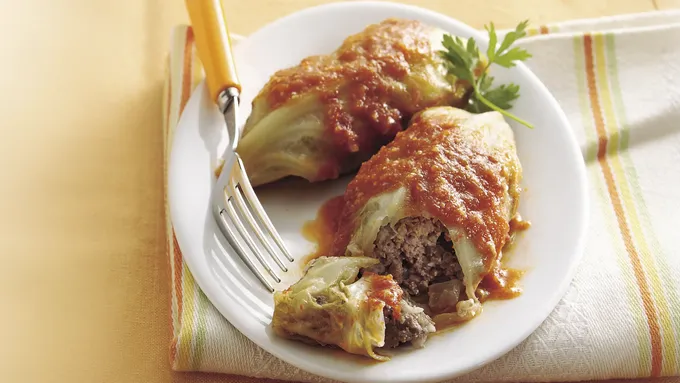 Step2In medium bowl, mix ground beef, uncooked rice, 1/3 cup milk, the egg, Worcestershire sauce, 1/4 teaspoon of the salt and 1/8 teaspoon of the pepper. Spoon about 1/3 cup of the ground beef mixture on thick end of each cabbage leaf. Roll up, tucking sides in. Place filled cabbage leaves in 12-inch skillet, seam side down. Add broth and caraway seed. Cover; heat to boiling. Reduce heat; simmer 25 to 30 minutes or until thermometer inserted in center of ground beef mixture reads 160°F.
