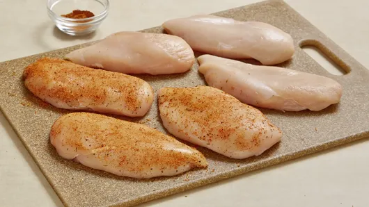 Step3Pat chicken dry with paper towels. Rub Cajun seasoning on both sides of chicken.