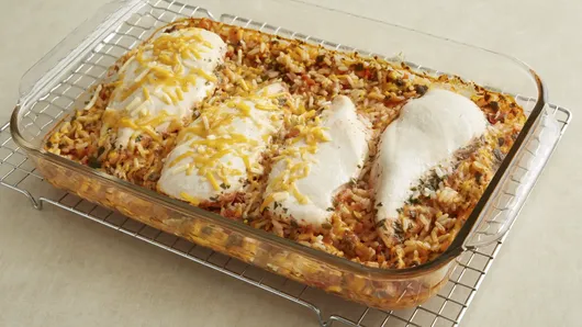 Step3Bake at 350°F. for 55 to 65 minutes or until chicken is fork-tender and juices run clear, and rice is tender. Uncover; sprinkle with reserved 1/2 cup cheese. Bake, uncovered, an additional 5 minutes or until cheese is melted.