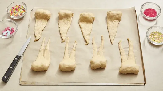 Step3Using pizza cutter or sharp knife, cut unrolled portion of dough to make two ears, starting at point of triangle and cutting toward rolled portion.