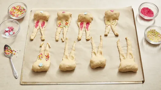 Step4Using finger, press indentation into bottom half of each ear; fold tops of ears down. Add small amount of nonpareils to indented portion of dough, and press heart onto stuffed dough portion for nose.